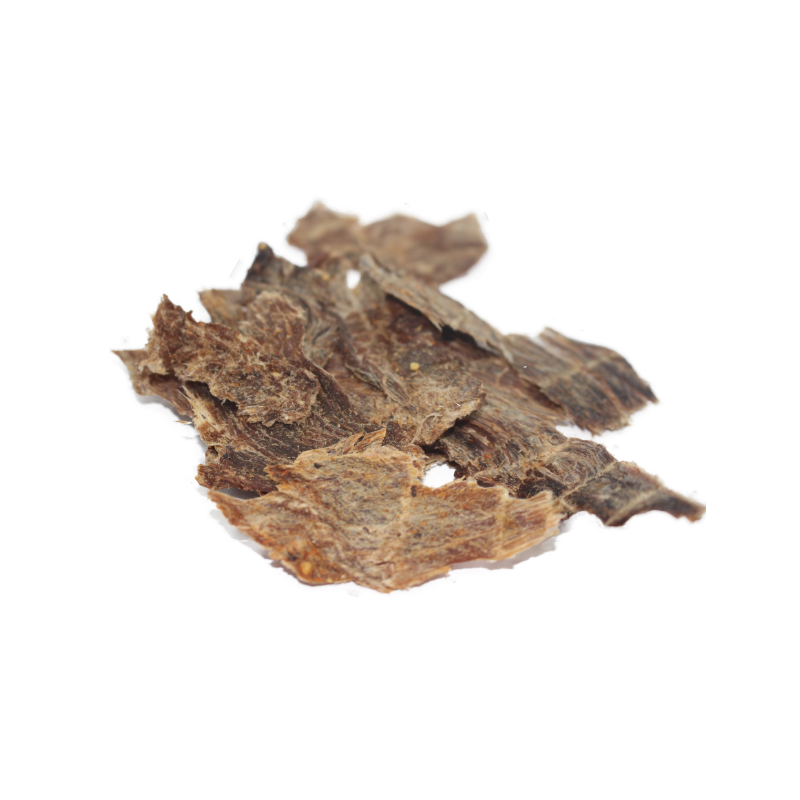 Láminas crujientes de carne seca gourmet, elaboradas a partir de pulpa negra magra, con una base de sal y limón acompañadas de una mezcla de hierbas finas, pimienta y laurel.
